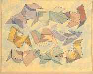 The style here is one of flat color and overlapping planes, as in the paintings of Stuart Davis... but the variations of motif are very different from Davis's approach.