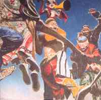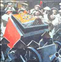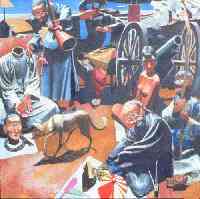 The official flea market has opened. One may be startled to see what is for sale. Scholars and women have nothing to sell but their heads and bodies. The servants of the royal emperor have only their ranking hat or rubber stamp to sell. Those that sell religious prophecies always make a good living -- as long as people believe, they will buy predictions of the future. The richest salesmen are the emperor's army generals, because they have permission to sell their arms. The busiest person in the painting is the tax collector.