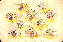 Here the ten whirling configurations are entirely spontaneous with no changes or overpainting. Ten little tornadoes, each with its own setting, are what they suggest to me.