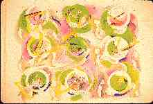 The theme, which developed from nine circles and the strident yellow-green hue, attempts to overcome and yet include this harsh color in the general design. The title fits this situation in a whimsical way.