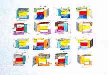 Straight lines, high key colors, and the illusion of folded planes with shadows cast across them make up the variations here.