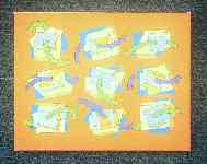 These variations can be seen as sketches for large cut-out wall pieces, where the background yellow is the wall and the six variations are painted on shaped canvas to be hung individually.
